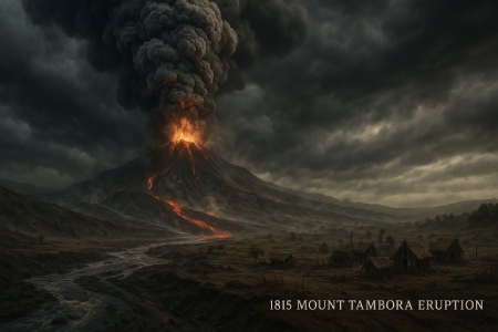 The 1815 eruption of Mount Tambora in Indonesia discharged about 160 cubic kilometers of volcanic material into the atmosphere, affording the famous "Year Without a Summer" in 1816. Temperatures fell worldwide and mass famines and crop failures made major migrations into Europe and North America common. Social unrest, arid, newly introduced agricultural techniques, and improved supply strategies marked the communities. The eruption had its impact on culture: in the wake of the tsunami, poets and painters chose to portray their new-found vulnerability to the forces of nature. Changes in trade flows accompanied policy changes on import and export matters as governments tried to face shortage. In this sense, Tambora provides an example of just a single volcanic event that can affect climate regime, human movements, economic stability, and culture expressions, thus demonstrating the interlinked nature of natural events and human society.